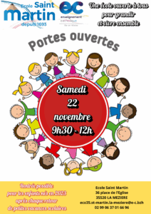 Si vous souhaitez inscrire votre enfant pour la rentrée 2026 en classe de la Petite Section au CM2 ou si vous voulez que votre enfant né en 2023 intègre l’école en classe de Toute Petite Section sur cette année scolaire, n’hésitez pas à venir nous rencontrer lors de nos portes ouvertes qui auront lieu le samedi 22 novembre, de 9h30 à 12h.